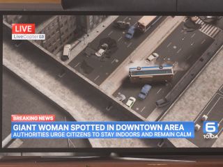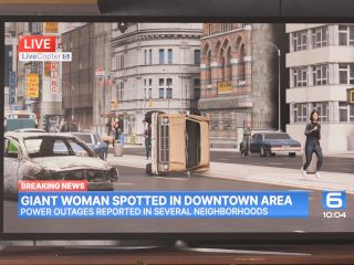 The narrative focuses on the visual spectacle of an enormous figure navigating everyday objects, stepping over miniature structures, and exuding authority without spoken dialogue, making it perfect for fans seeking pure visual stimulation.
